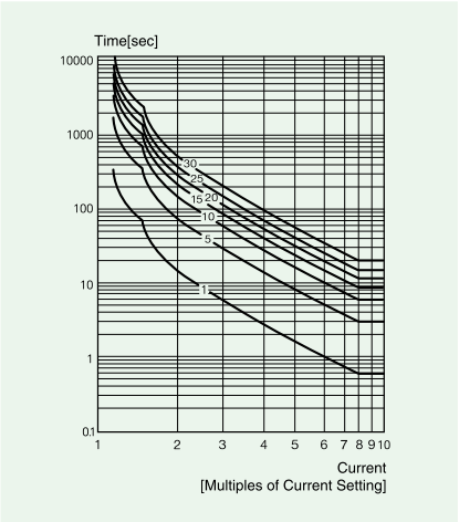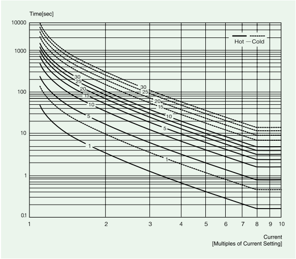 TCC=In(反時(shí)限) 反時(shí)限過電流保護(hù):動(dòng)作時(shí)間隨電流的增大而自動(dòng)減小的保護(hù) 反時(shí)限曲線分為hot curve和cold Curve兩種曲線,反時(shí)限動(dòng)作特性曲線是以1~30 Class區(qū)分。 Cold Curve適用于電動(dòng)機(jī)起動(dòng)過程中(D -time時(shí)間段), 實(shí)線顯示Hot Curve為經(jīng)過D -time后電動(dòng)機(jī)運(yùn)行過程中使用的曲線。 |