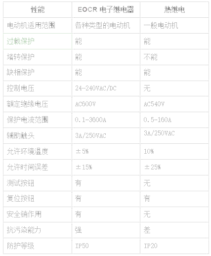 EOCR-SS與熱繼電器性能指標(biāo)對照表